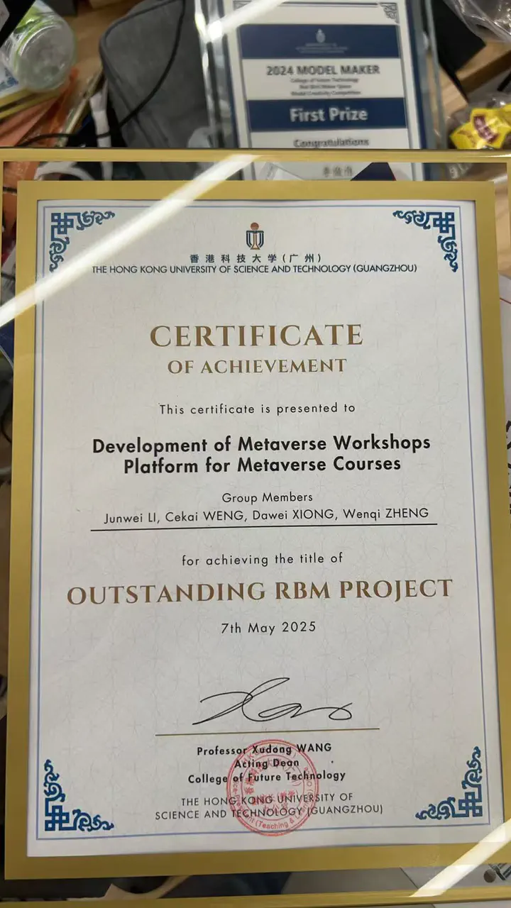 Received the 2025 HKUST (Guangzhou) RedBird Outstanding RBM Project Award for “Development of metaverse workshops platform for metaverse courses”. Team: Junwei Li, Dawei Xiong, Cekai Weng, Wenqi Zheng.
