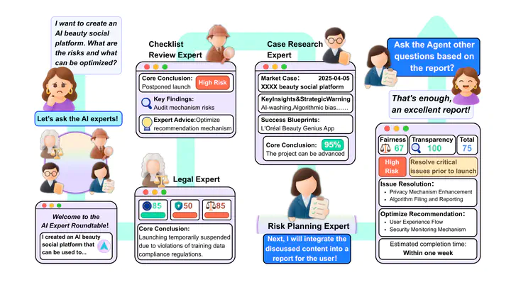 As generative AI enters enterprise workflows, ensuring compliance with legal, ethical, and reputational standards becomes a pressing challenge. In beauty tech, where biometric and personal data are central, traditional reviews are often manual, fragmented, and reactive. To examine these challenges, we conducted a formative study with six experts (four IT managers, two legal managers) at a multinational beauty company. The study revealed pain points in rule checking, precedent use, and the lack of proactive guidance.Motivated by these findings, we designed a multi-agent “roundtable” system powered by a large language model. The system assigns role-specialized agents for legal interpretation, checklist review, precedent search, and risk mitigation, synthesizing their perspectives into structured compliance advice.We evaluated the prototype with the same experts using System Usability Scale(SUS), The Official NASA Task Load Index(NASA-TLX), and interviews. Results show exceptional usability (SUS:77.5/100) and minimal cognitive workload, with three key findings:(1) multi-agent systems can preserve tacit knowledge into standardized workflows, (2) information augmentation achieves higher acceptance than decision automation, and (3) successful enterprise AI should mirror organizational structures. This work contributes design principles for human-AI collaboration in compliance review, with broader implications for regulated industries beyond beauty tech.