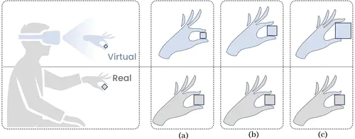 Sandplay is an effective psychotherapy for mental retreatment, and many people prefer to engage in sandplay in Virtual Reality (VR) due to its convenience. Haptic perception of physical objects and miniatures enhances the realism and immersion in VR. Previous studies have rendered sizes by exerting pressure on the user’s fingertips or employing tangible, shape-changing devices. However, these interfaces are limited by the physical shapes they can assume, making it difficult to simulate objects that grow larger or smaller than the interface. Motivated by literature on visual-haptic illusions, this work aims to convey the haptic sensation of a virtual object’s shape to the user by exploring the relationships between the haptic feedback from real objects and their visual renderings in VR. Our study focuses on the confirmation and adjustment ratios for different virtual object sizes. The results show that the likelihood of participants confirming the correct size of virtual cubes decreases as the object size increases, requiring more adjustments for larger objects. This research provides valuable insights into the relationships between haptic sensations and visual inputs, contributing to the understanding of visual-haptic illusions in VR environments.